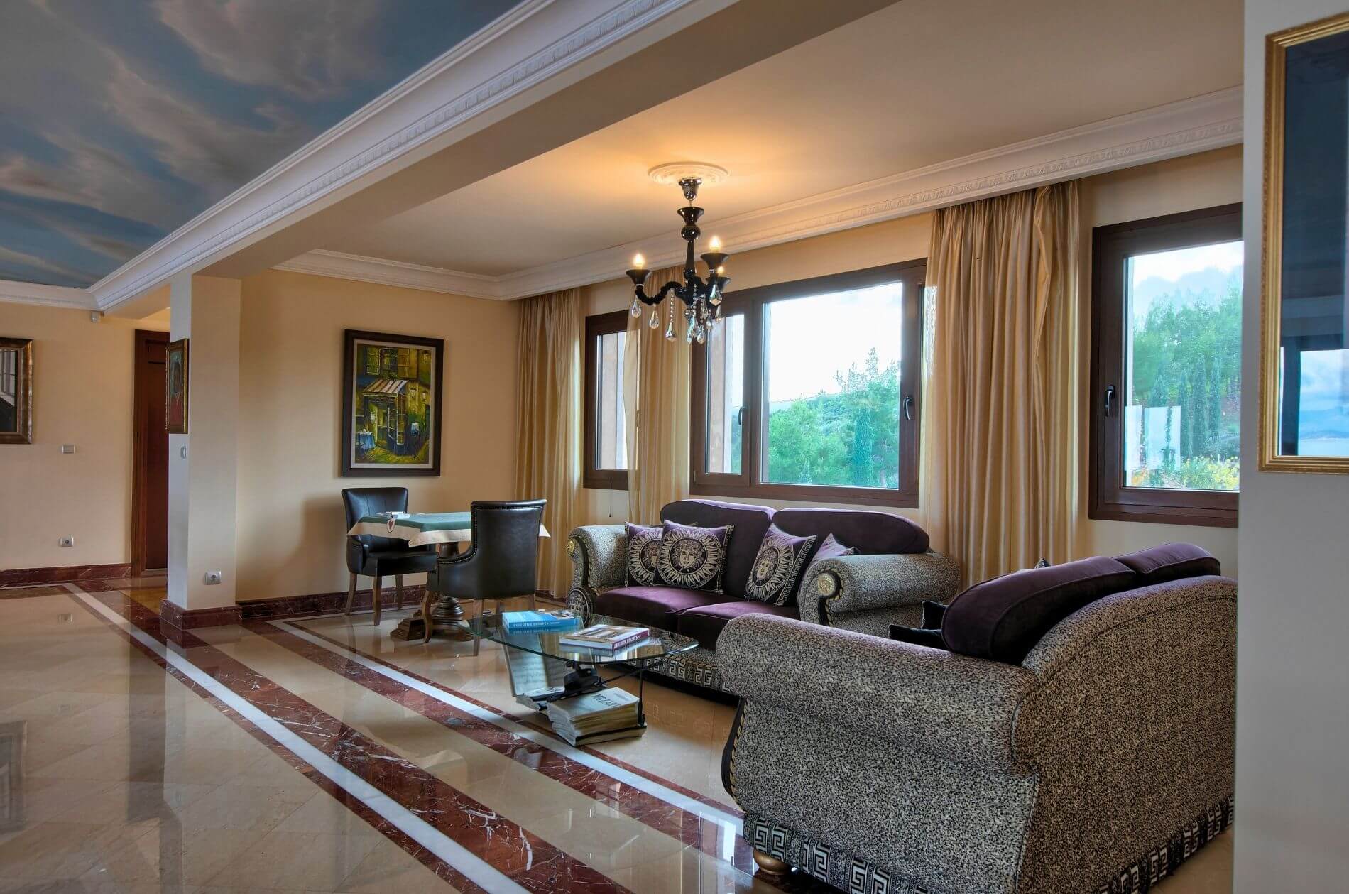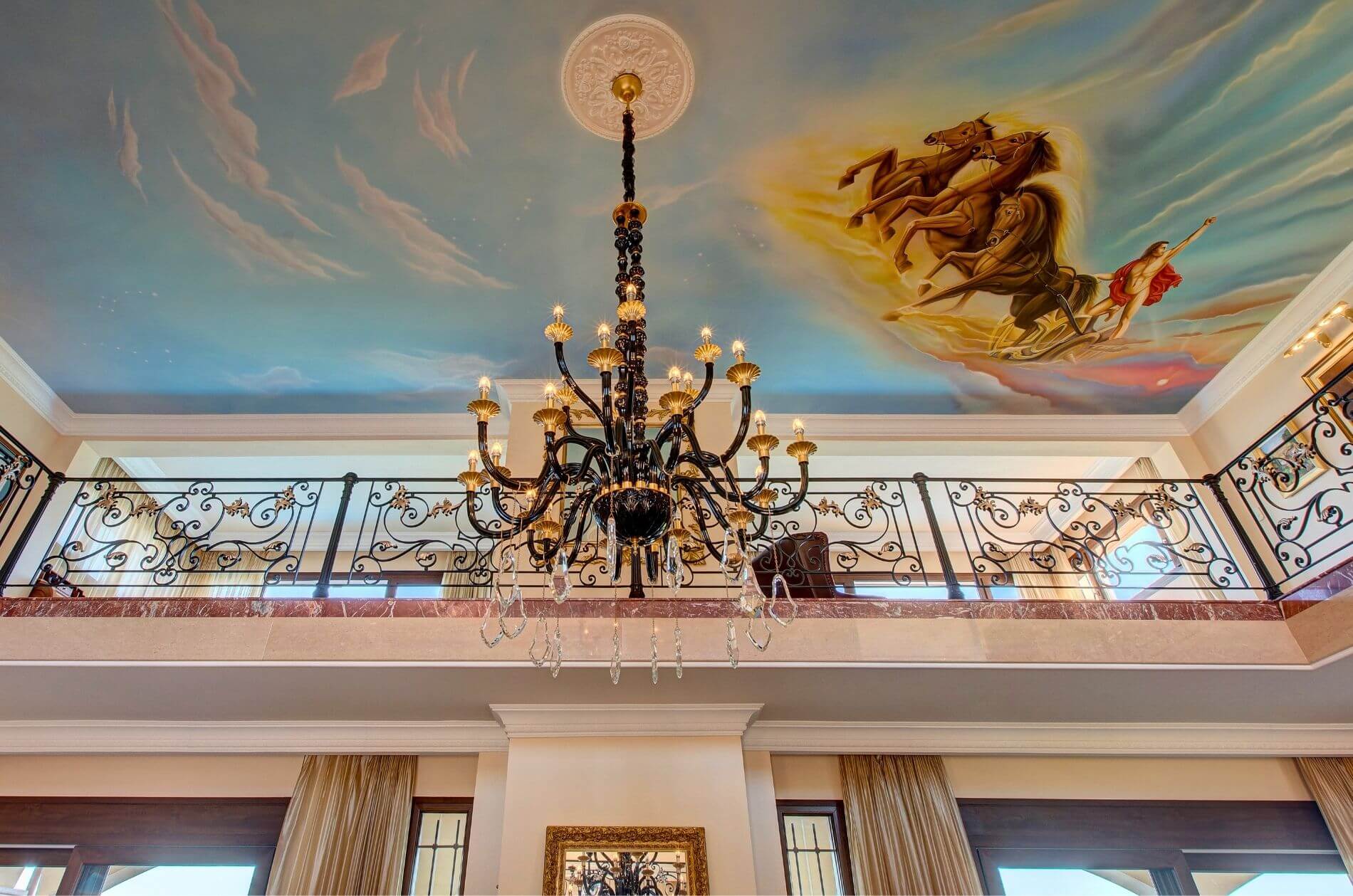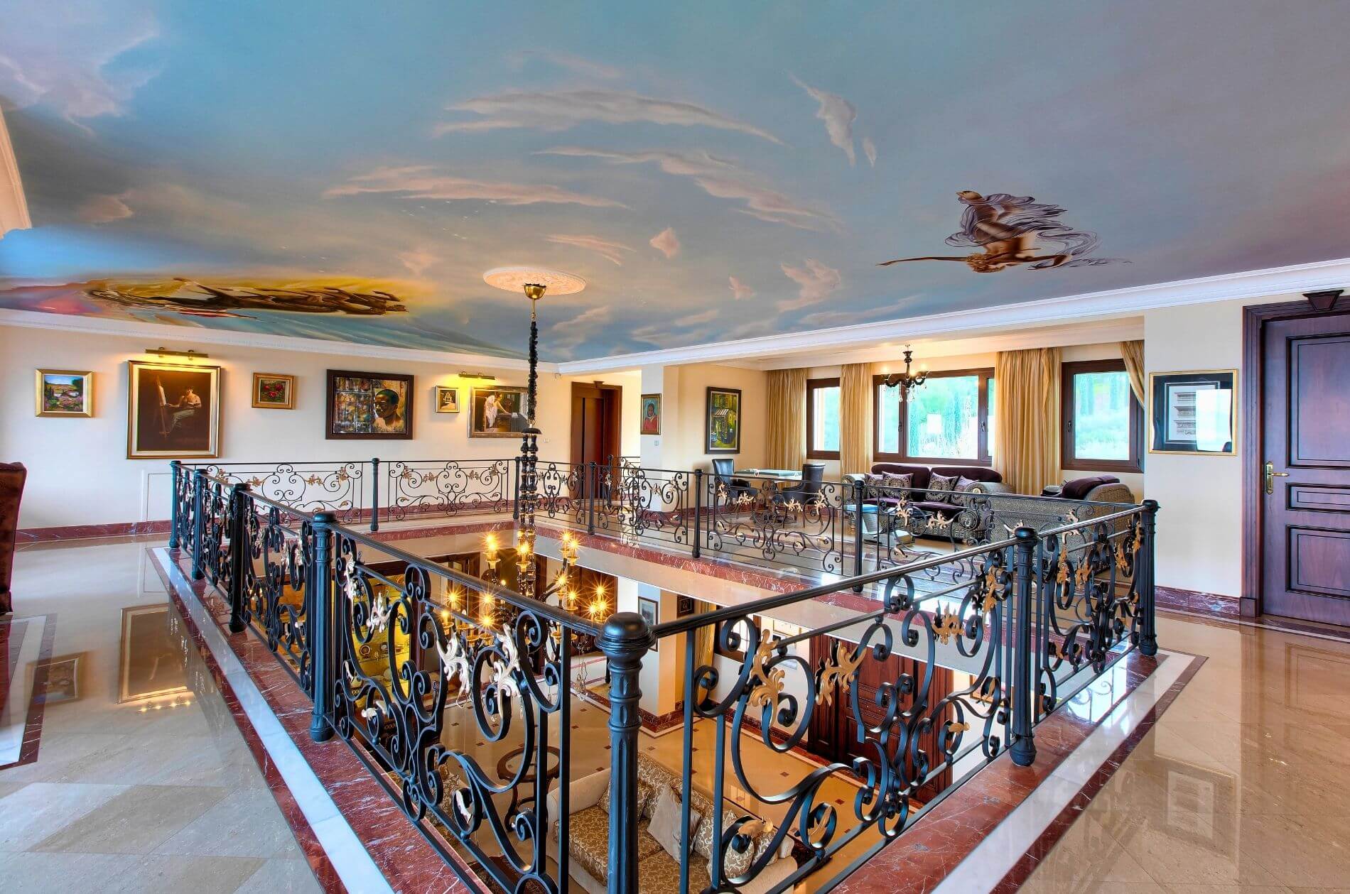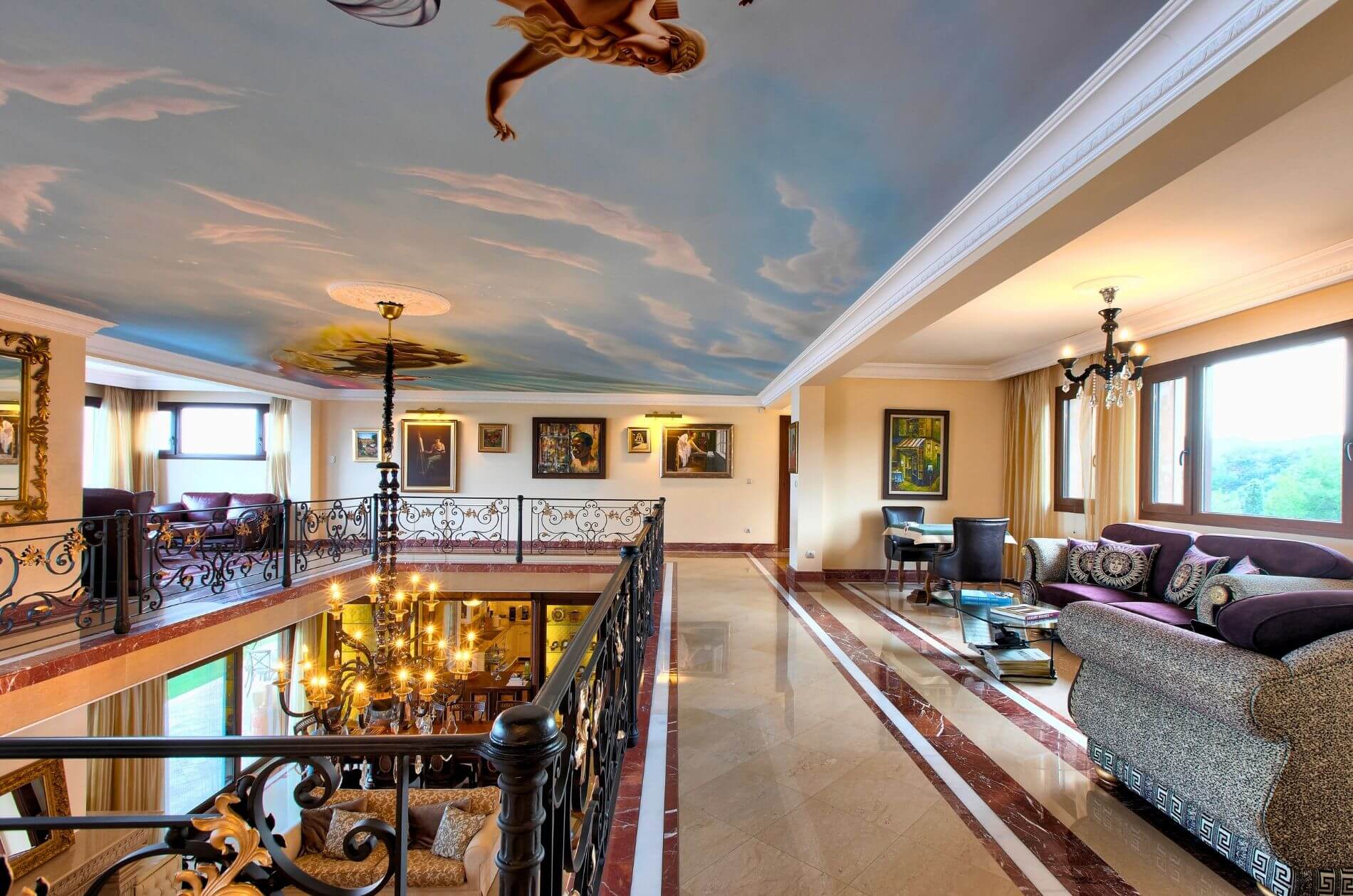 The two living areas, centered around a focal fireplace, blend comfort with architectural sophistication. In the main salon, the ceiling fresco and the Venetian Murano crystal chandelier lend a discreet “palazzo” feel without being overstated.