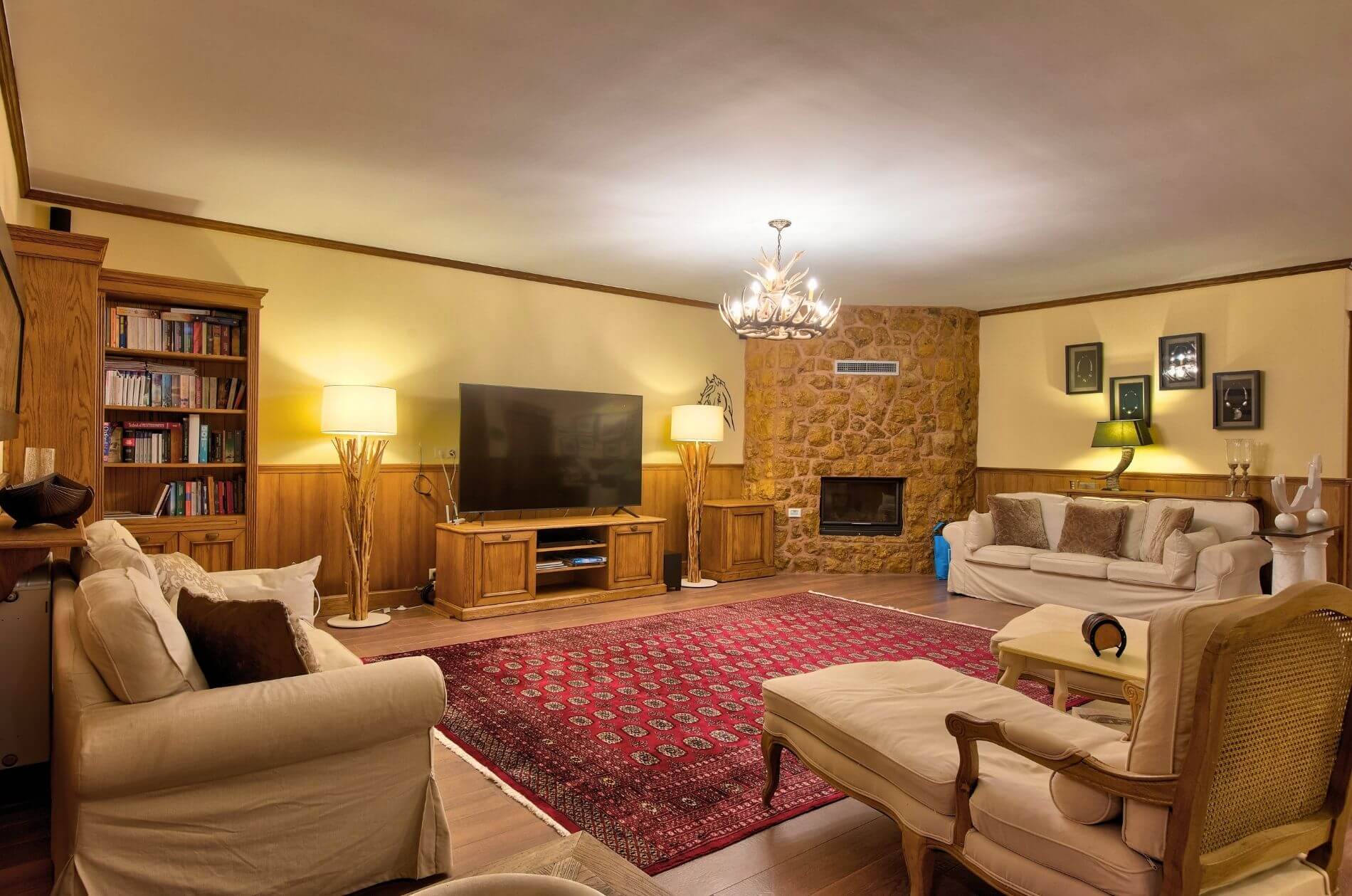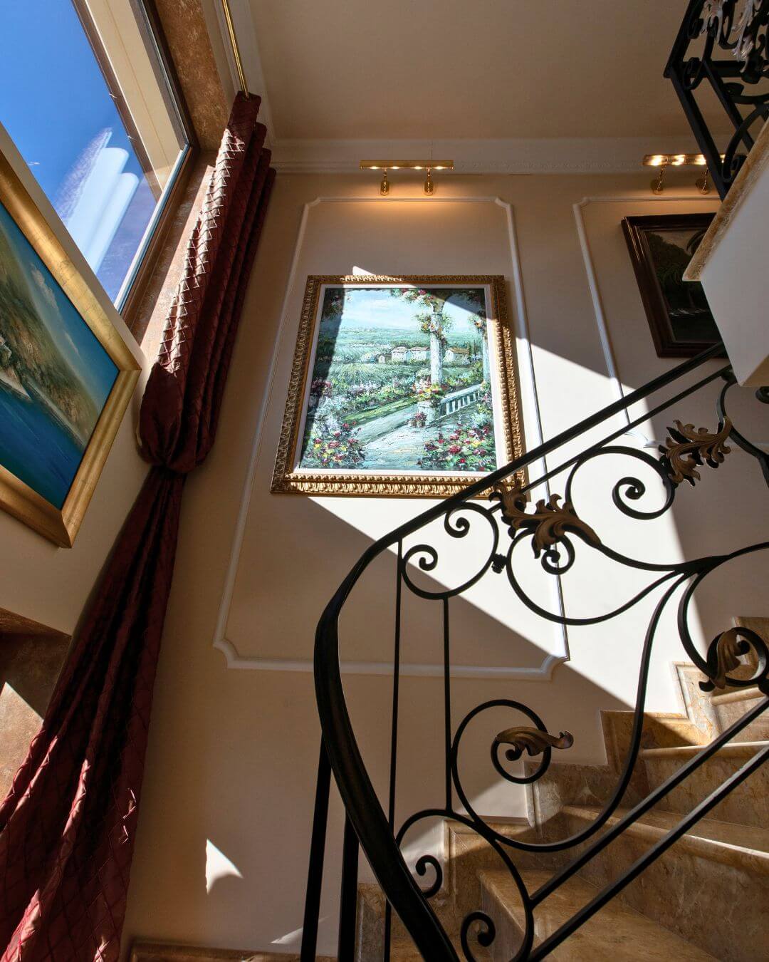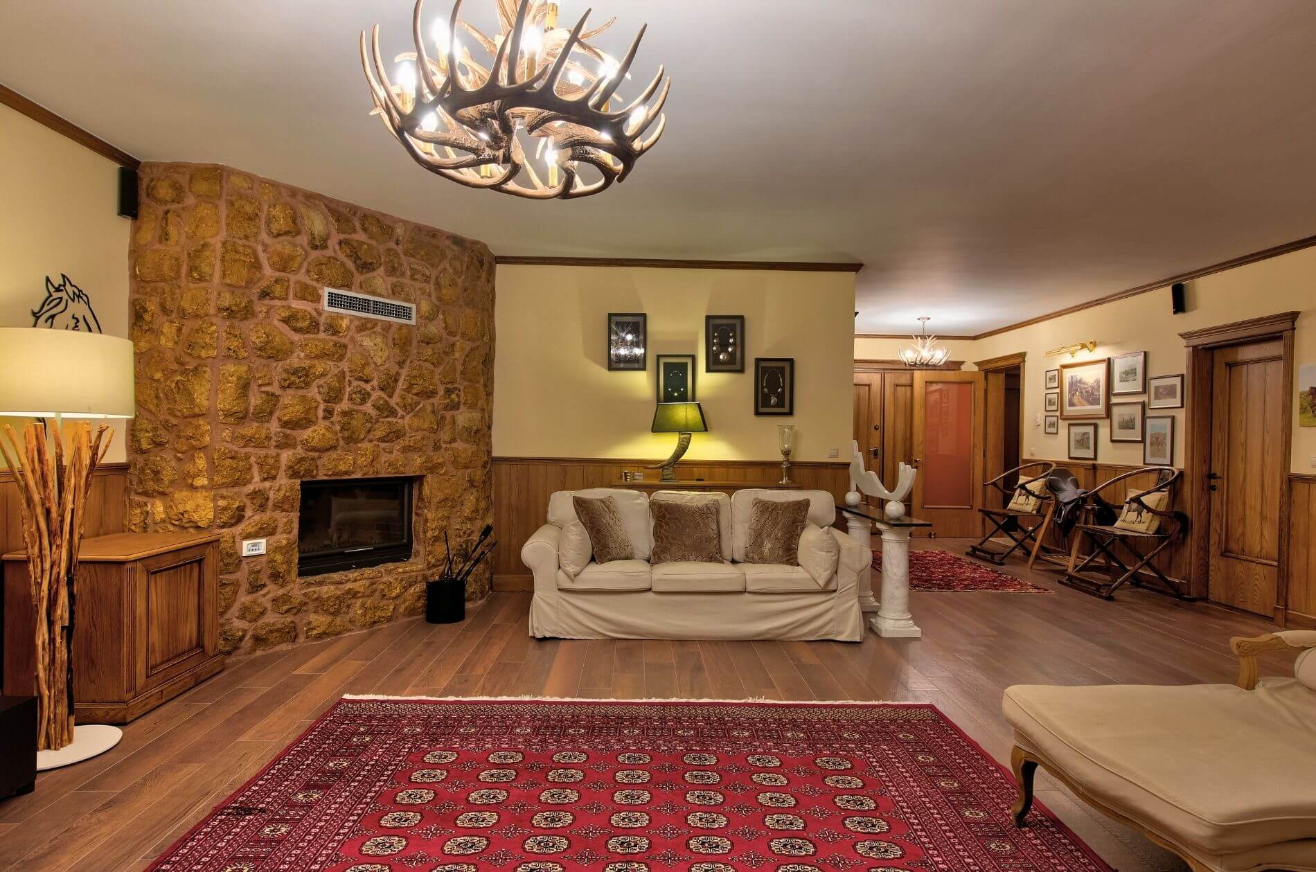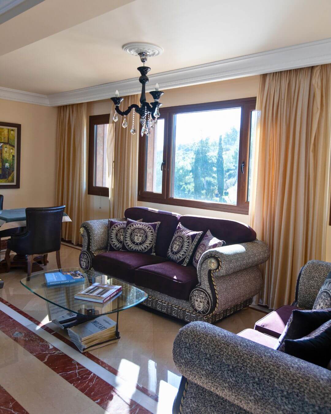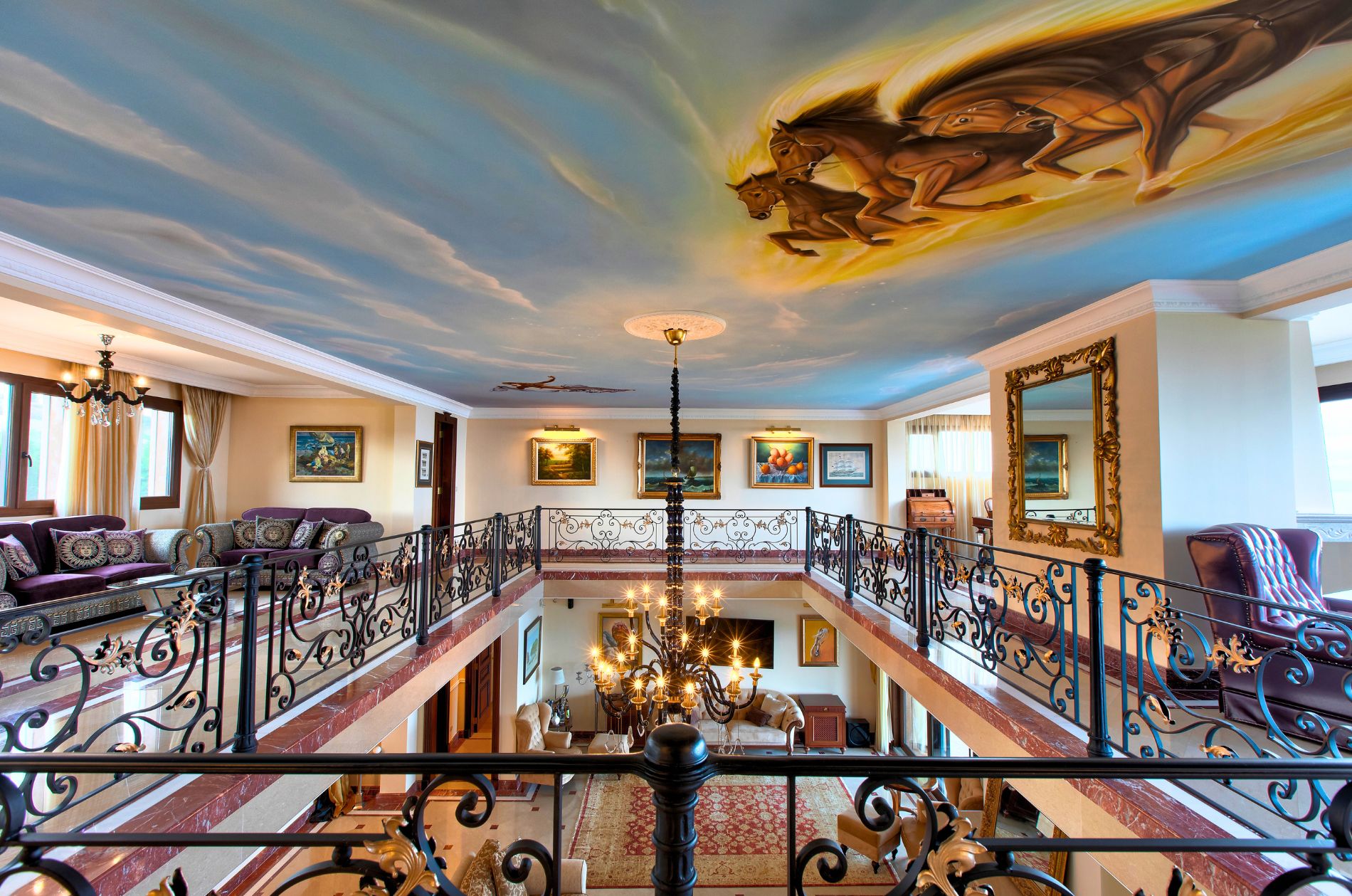 The two living areas, centered around a focal fireplace, blend comfort with architectural sophistication. In the main salon, the ceiling fresco and the Venetian Murano crystal chandelier lend a discreet “palazzo” feel without being overstated.
