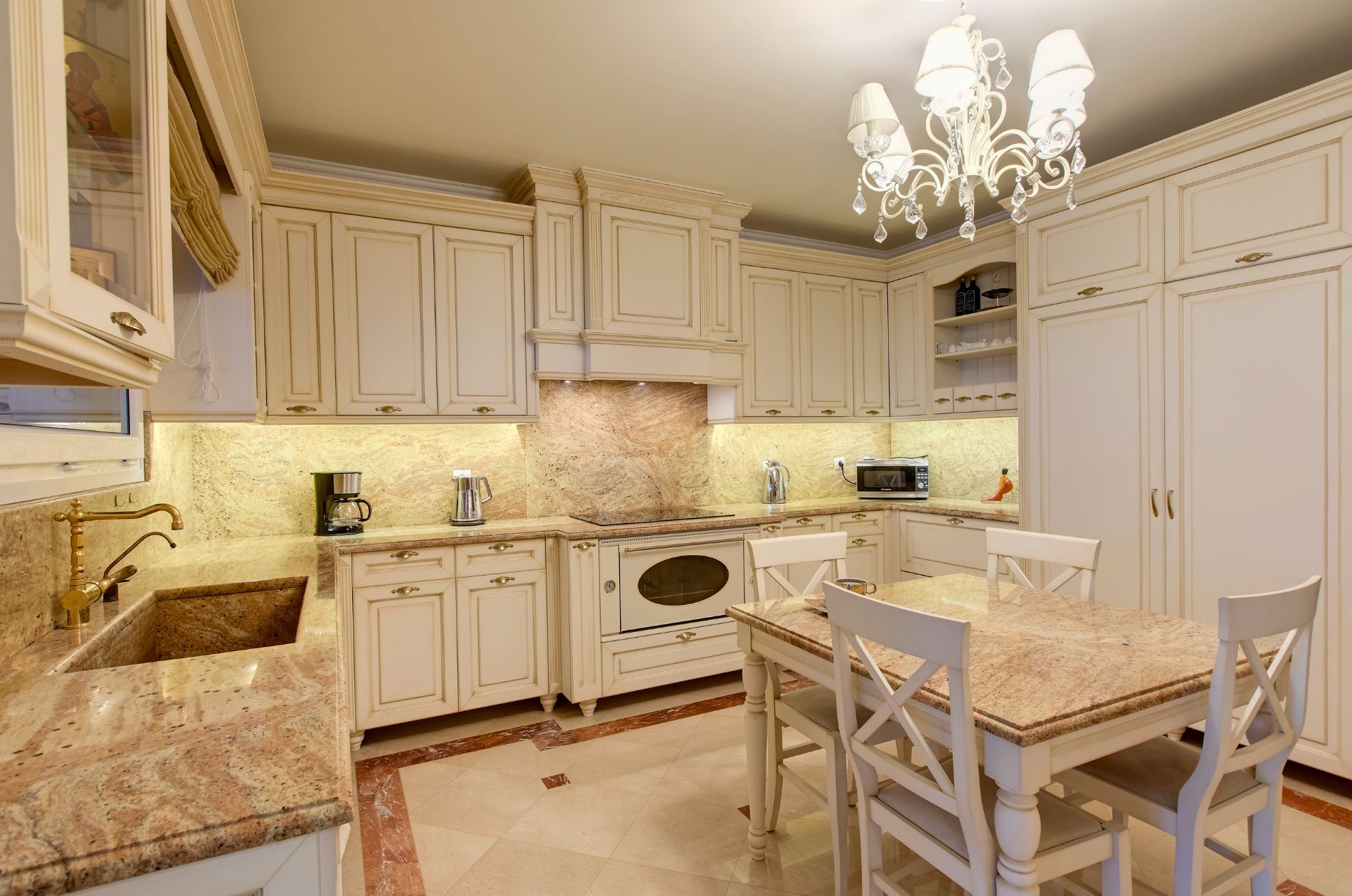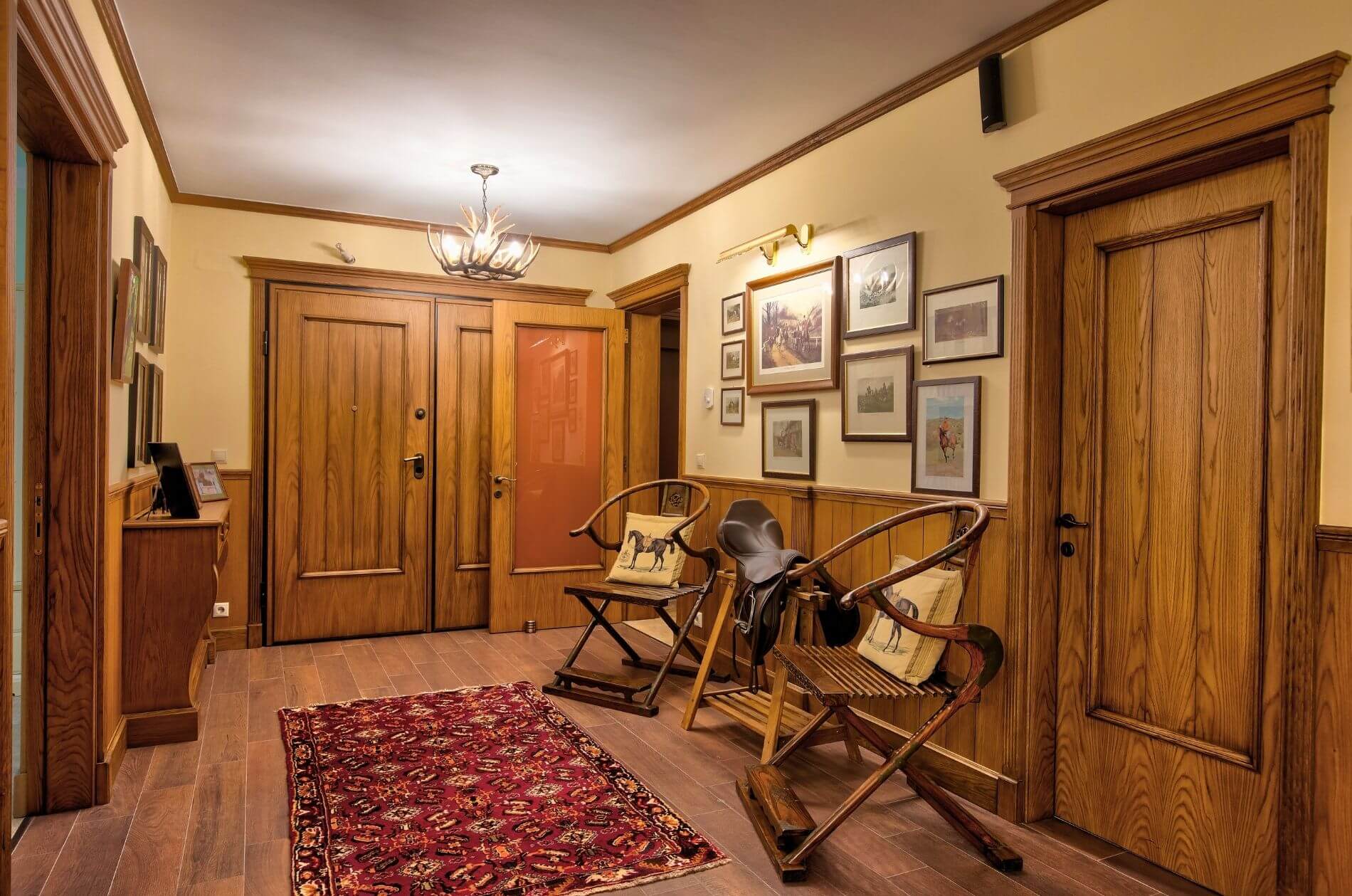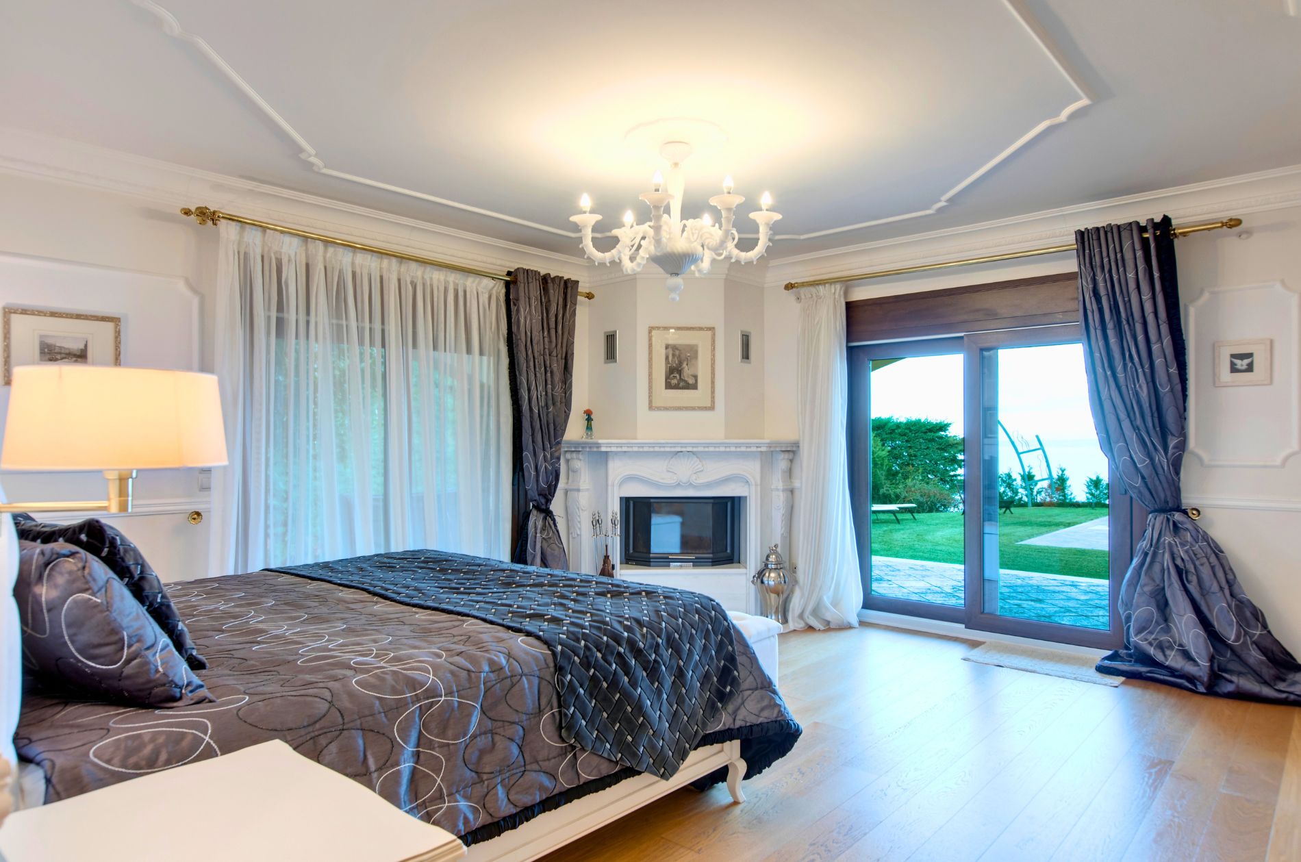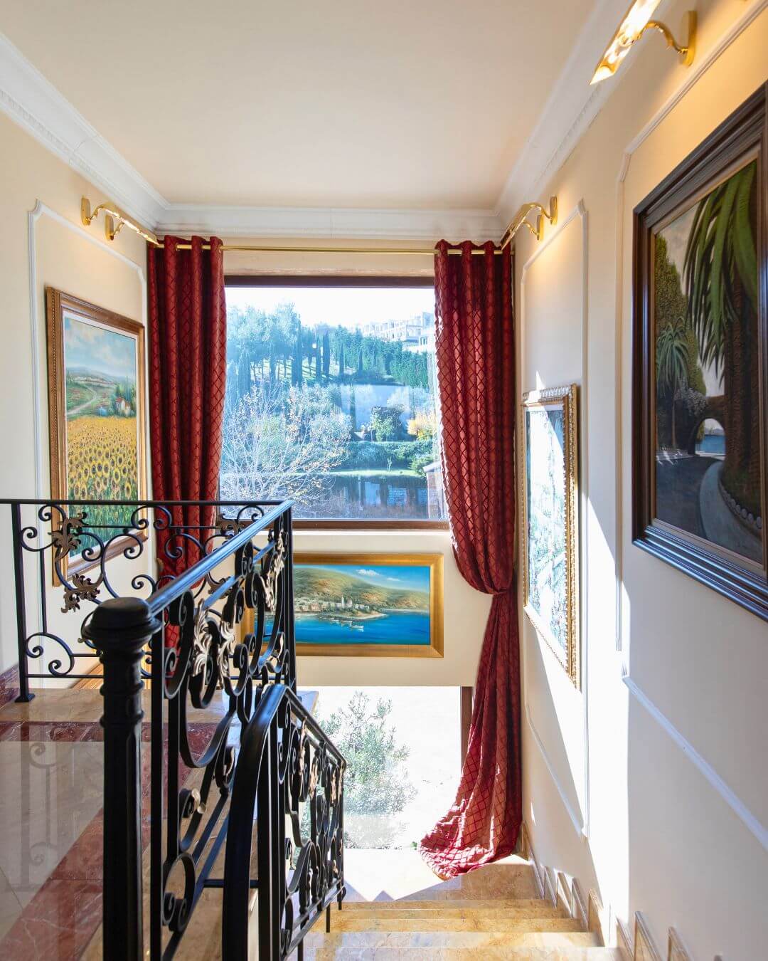 The two living areas, centered around a focal fireplace, blend comfort with architectural sophistication. In the main salon, the ceiling fresco and the Venetian Murano crystal chandelier lend a discreet “palazzo” feel without being overstated.