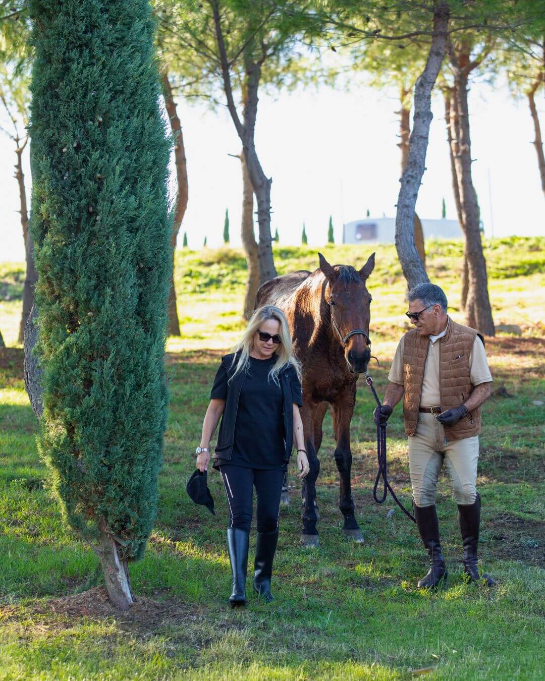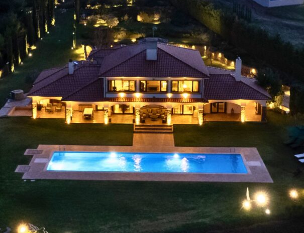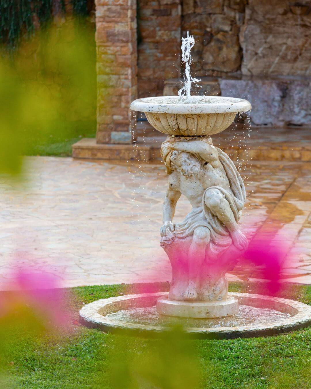 In a distinct part of the estate, a square featuring a traditional fountain and spring creates a second gathering point, while a cypress-lined path leads to the private forest and the illuminated stables.