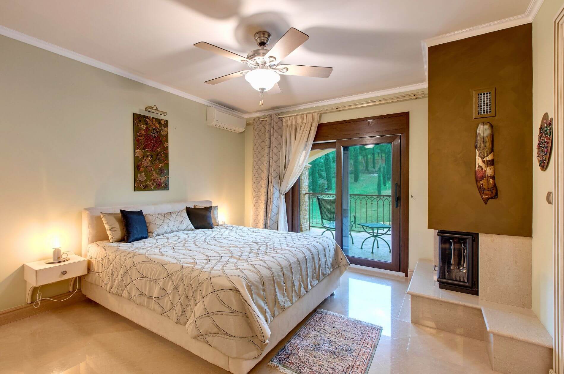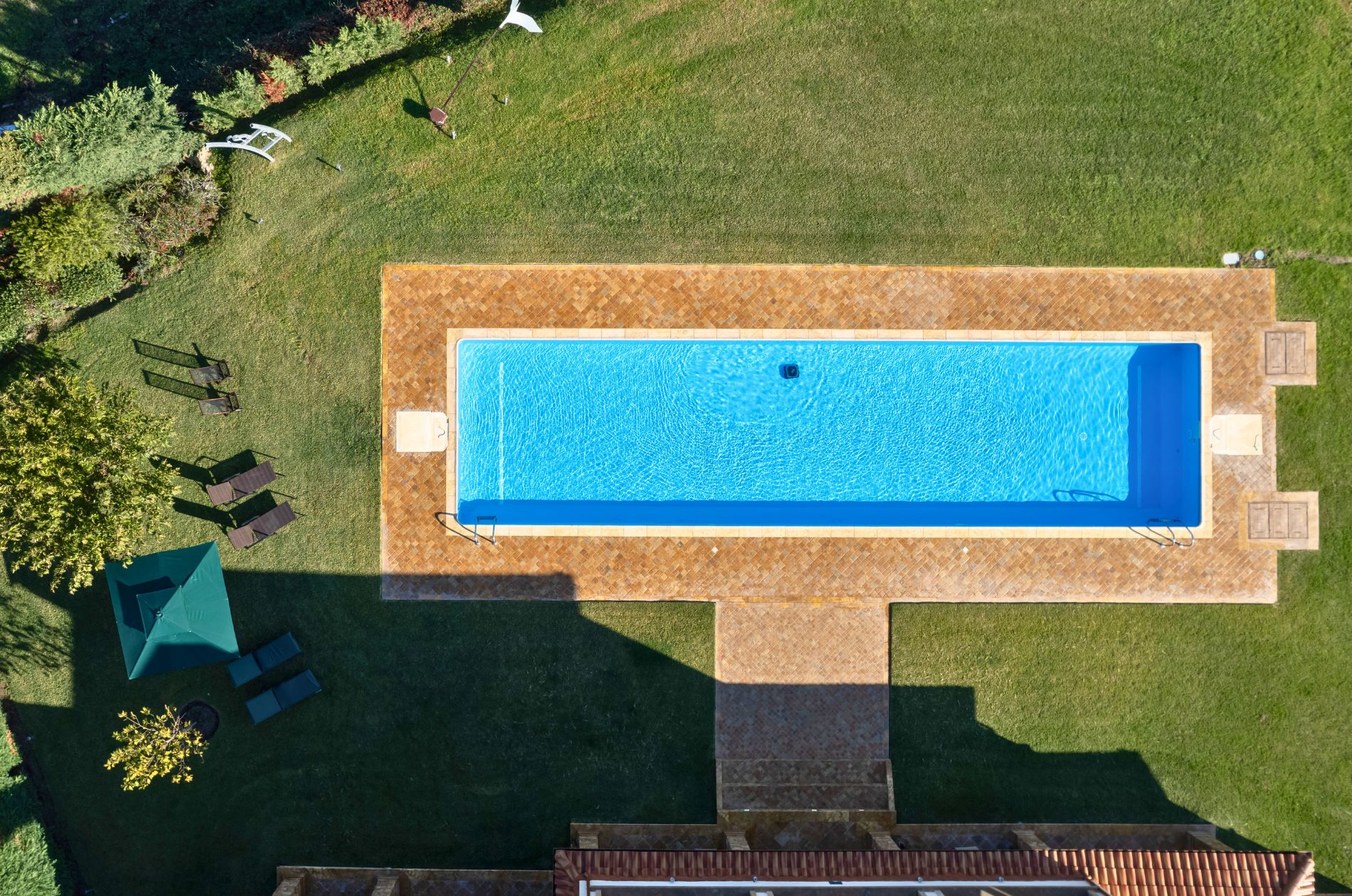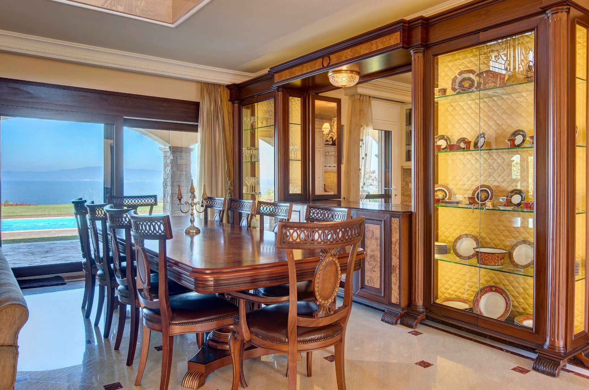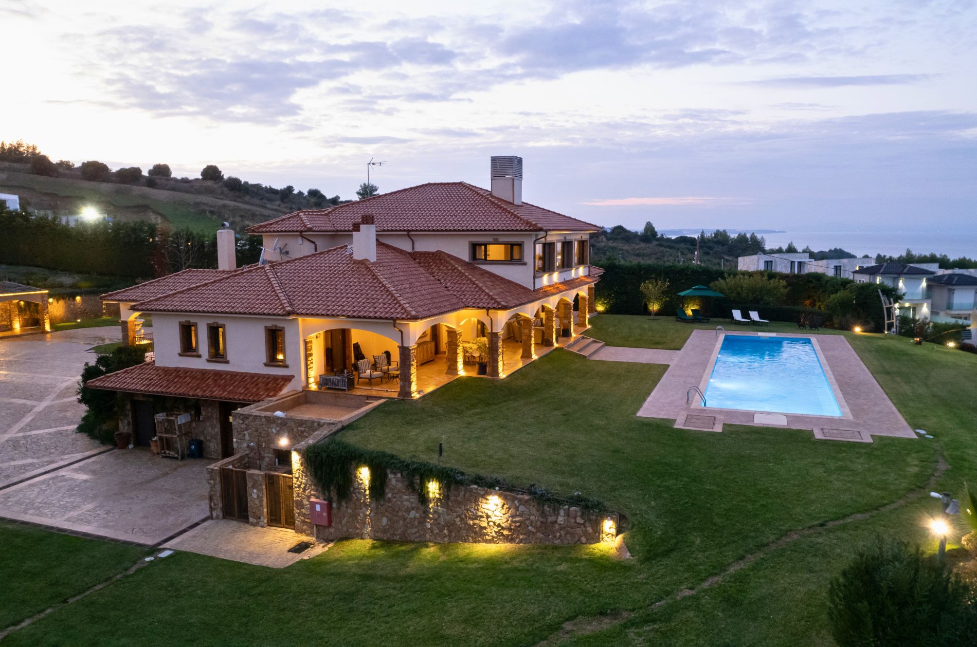 This level opens directly onto the outdoor spaces: the 5 × 20 m. swimming pool, sunbeds on the lawn, lounge areas sheltered under stone arches, and an outdoor twelve-person dining area offering unobstructed views of the Toroneos Gulf and the entirety of Chalkidiki.